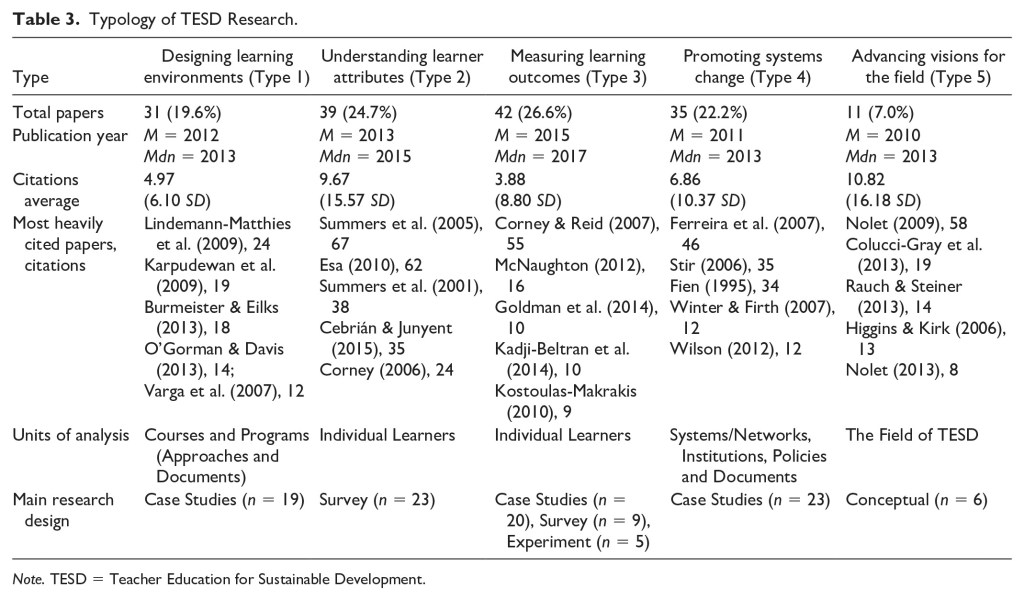 Fischer, D., King, J., Rieckmann, M., Barth, M., Büssing, A., Hemmer, I., & Lindau-Bank, D. (2022). Teacher Education for Sustainable Development: A Review of an Emerging Research Field. Journal of Teacher Education, 73(5), 509–524. https://doi.org/10.1177/00224871221105784
